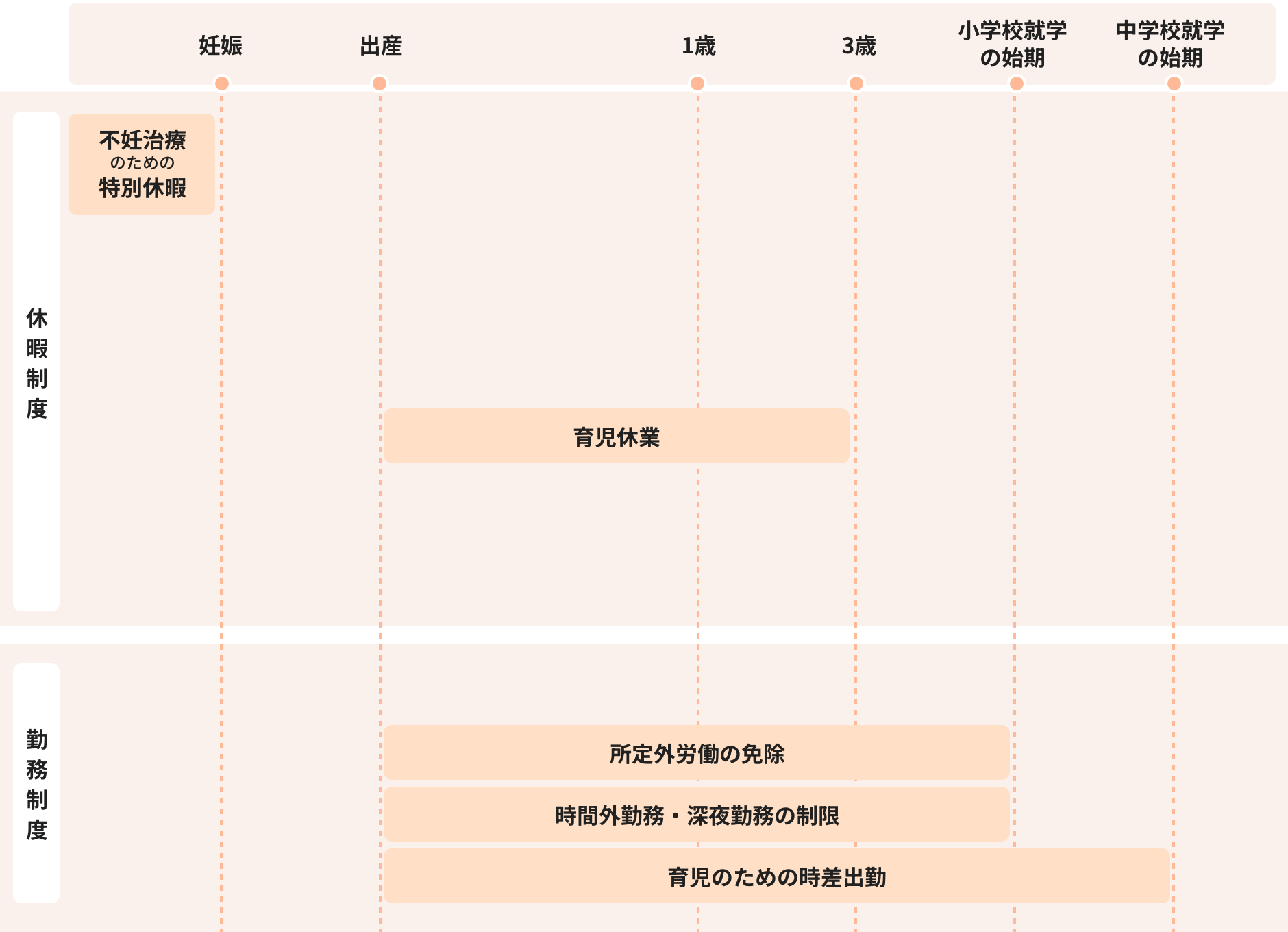 妊婦健診などの時間の確保やラッシュ時間を避けた通勤などの措置を受けることができます (女性のみ利用可)