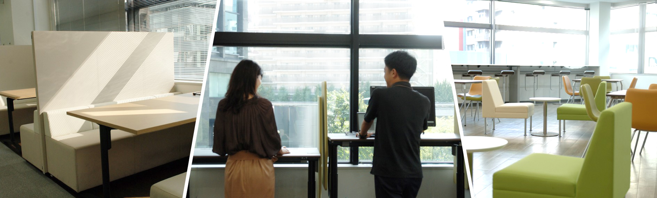 気軽に打ち合わせが可能な「ファミレス席」や「コミュニケーションルーム」、また集中して作業可能な「個室webブース」、「スタンディングデスク」などを設置しています。