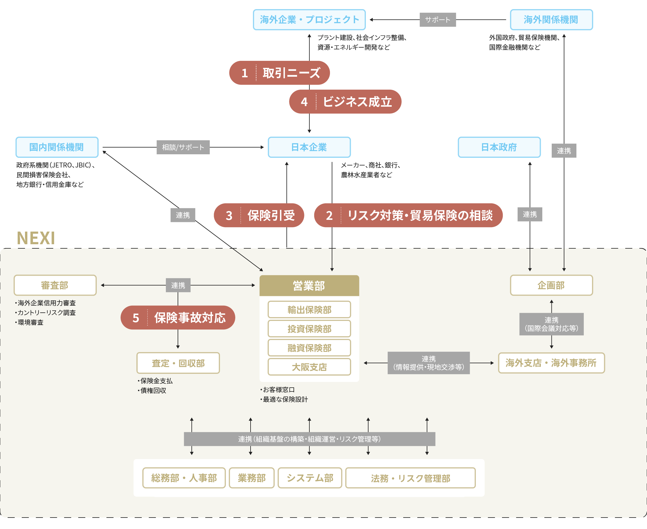 NEXIはこれらの企業活動に対し、案件相談やリスク審査、保険引受を行うことで、日本企業のビジネス成立に貢献しています。