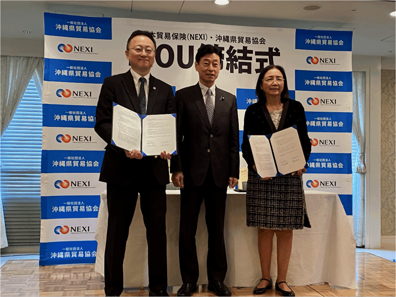 株式会社日本貿易保険(NEXI:代表取締役社長 黒田篤郎)と一般社団法人沖縄県貿易協会(沖縄県貿易協会:会長 新垣旬子)は沖縄県企業への貿易保険の普及において業務協力を行うため、西村康稔経済産業大臣ご臨席のもと、3月12日に覚書を締結しました。