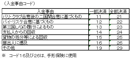 下記にサンプルとして貿易一般保険を掲載いたしますが、特に事故事由コードについては、各保険種仕様コードが異なるため、当ホームページ内、「貿易保険規程集」の手続細則別紙様式をダウンロードし、ご確認・使用くださいますようお願いいたします。なお、入金コード及び回収義務履行コードについては、仕様は同じです。